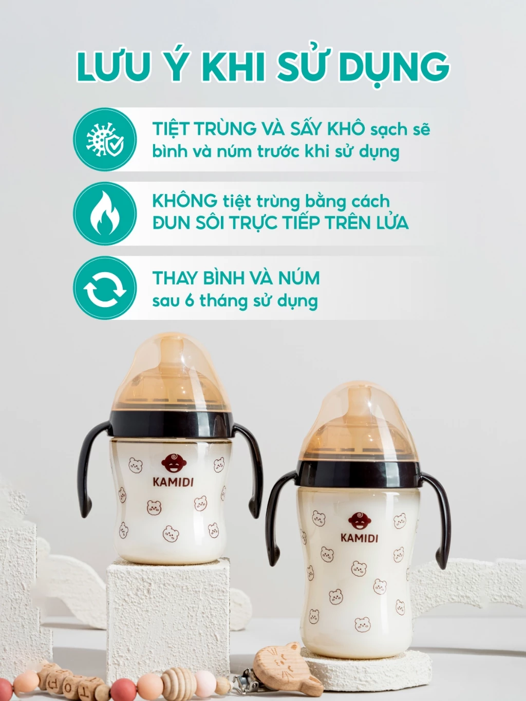 – Trước khi cho bé dùng, ba mẹ cần rửa sạch và vệ sinh bình sữa gấu Kamidi PPSU, núm ti bằng nước rửa bình sữa chuyên dụng, trụng qua nước nóng, hoặc dùng máy tiệt trùng, lò vi sóng.