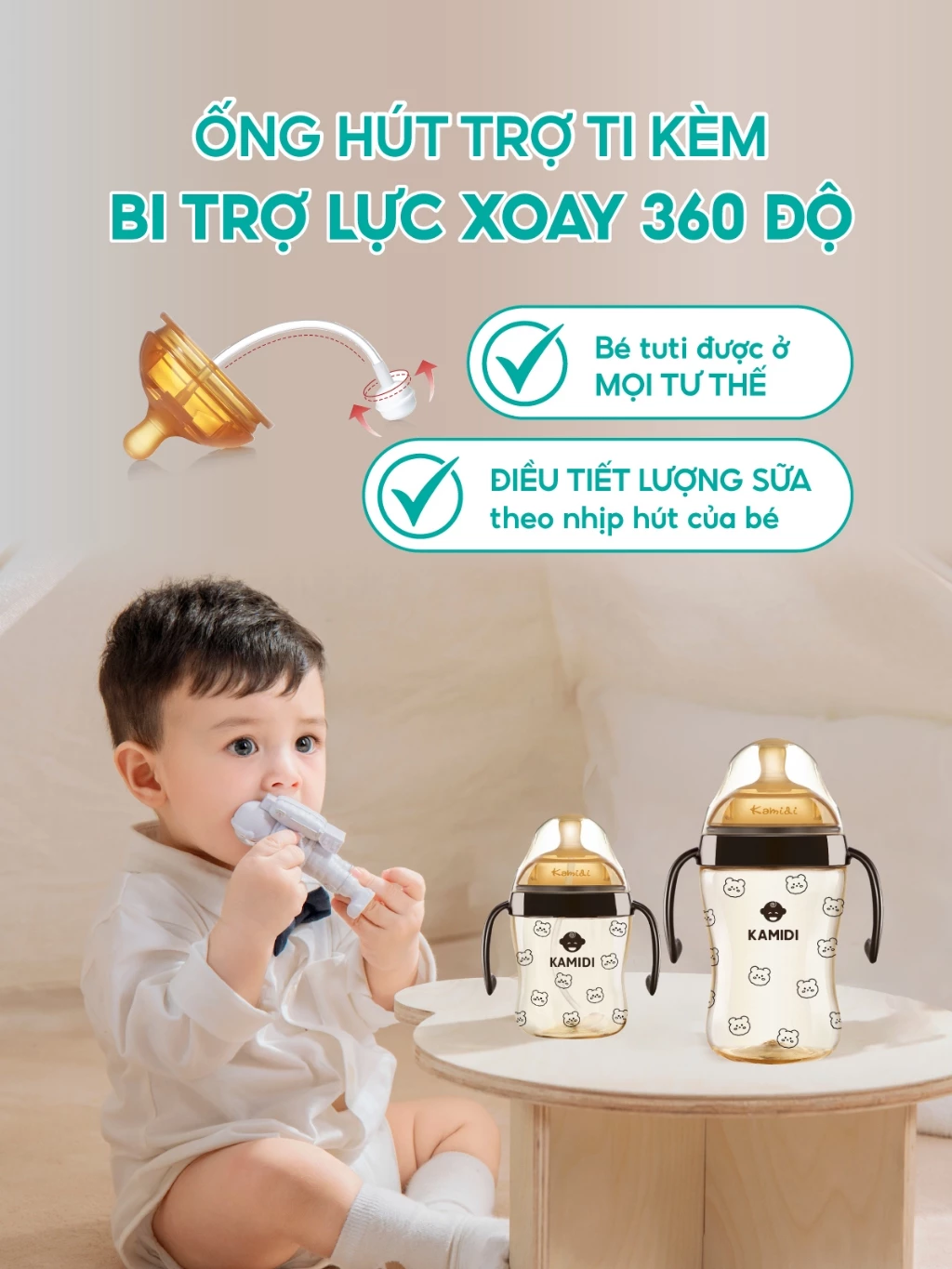 Trải qua nhiều năm nghiên cứu chuyên sâu về cử động bú mẹ tự nhiên của các em bé, các chuyên gia của Kamidi đã phát triển nhiều dòng bình sữa phù hợp với bé. Hệ thống van khí kép của bình sữa gấu Kamidi PPSU điều tiết lượng sữa chảy ra, hạn chế tình trạng bé đầy hơi, khó tiêu.